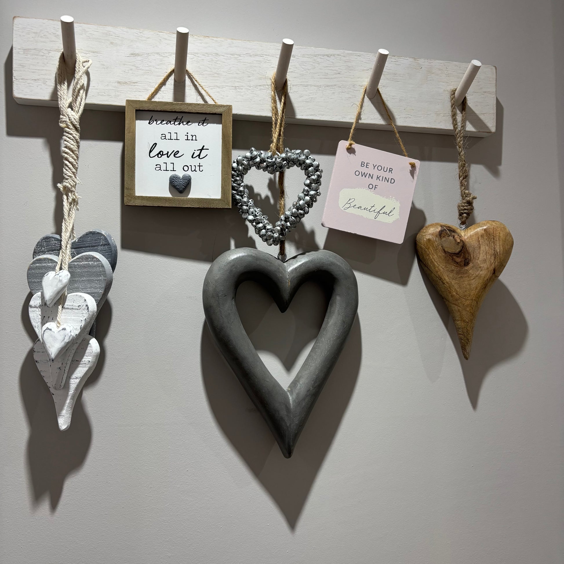 Bring a touch of rustic elegance to your home with this long wooden hanging heart. Crafted from solid wood with a chunky, tactile design, it’s a charming piece that adds warmth and character wherever it’s displayed.