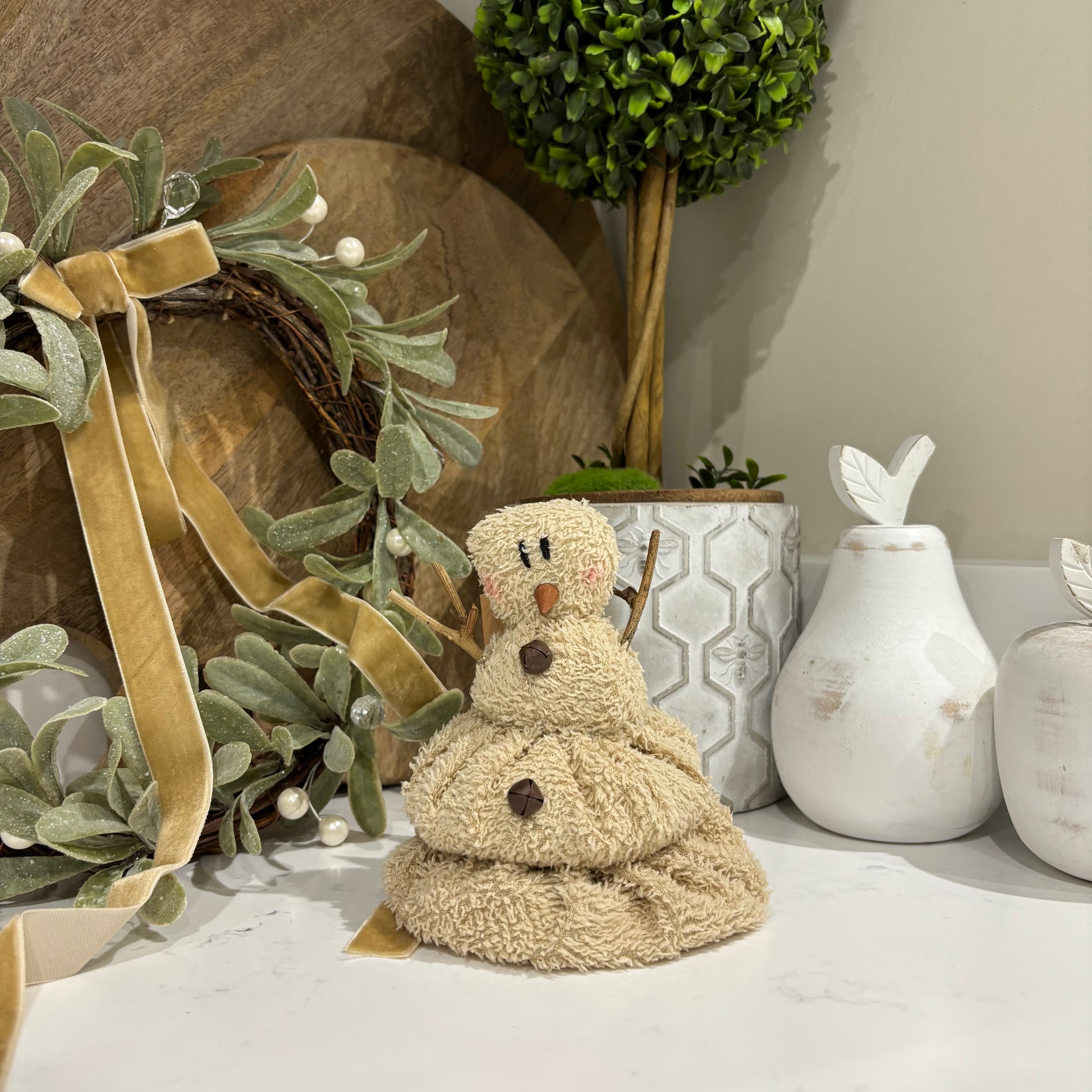 Bring festive cheer to your home with this adorable melting snowman. Made from soft, cozy fleece fabric and standing approximately 5" tall, this little snowman is designed with a beanbag base, allowing it to sit flat with a whimsical “melting” appearance that adds a playful touch to any holiday display.