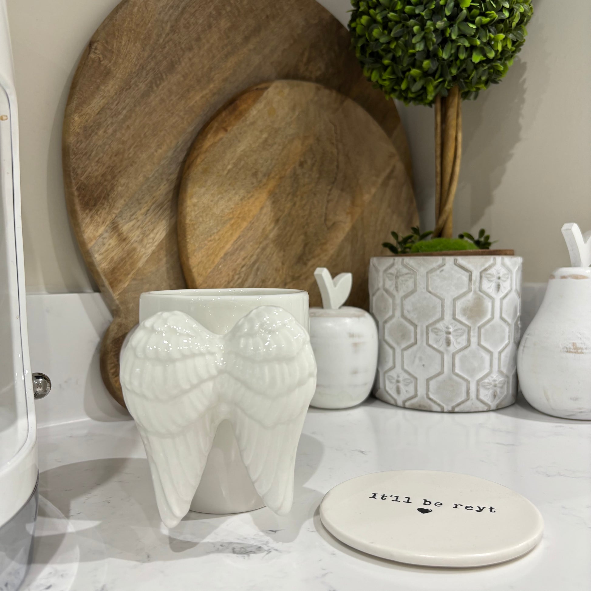 Enjoy your favourite hot drinks in this beautiful shabby chic–style angel wing mug, finished in a soft white tone. Featuring a delicate angel wing design, this mug adds a touch of elegance and charm to any kitchen or coffee moment.