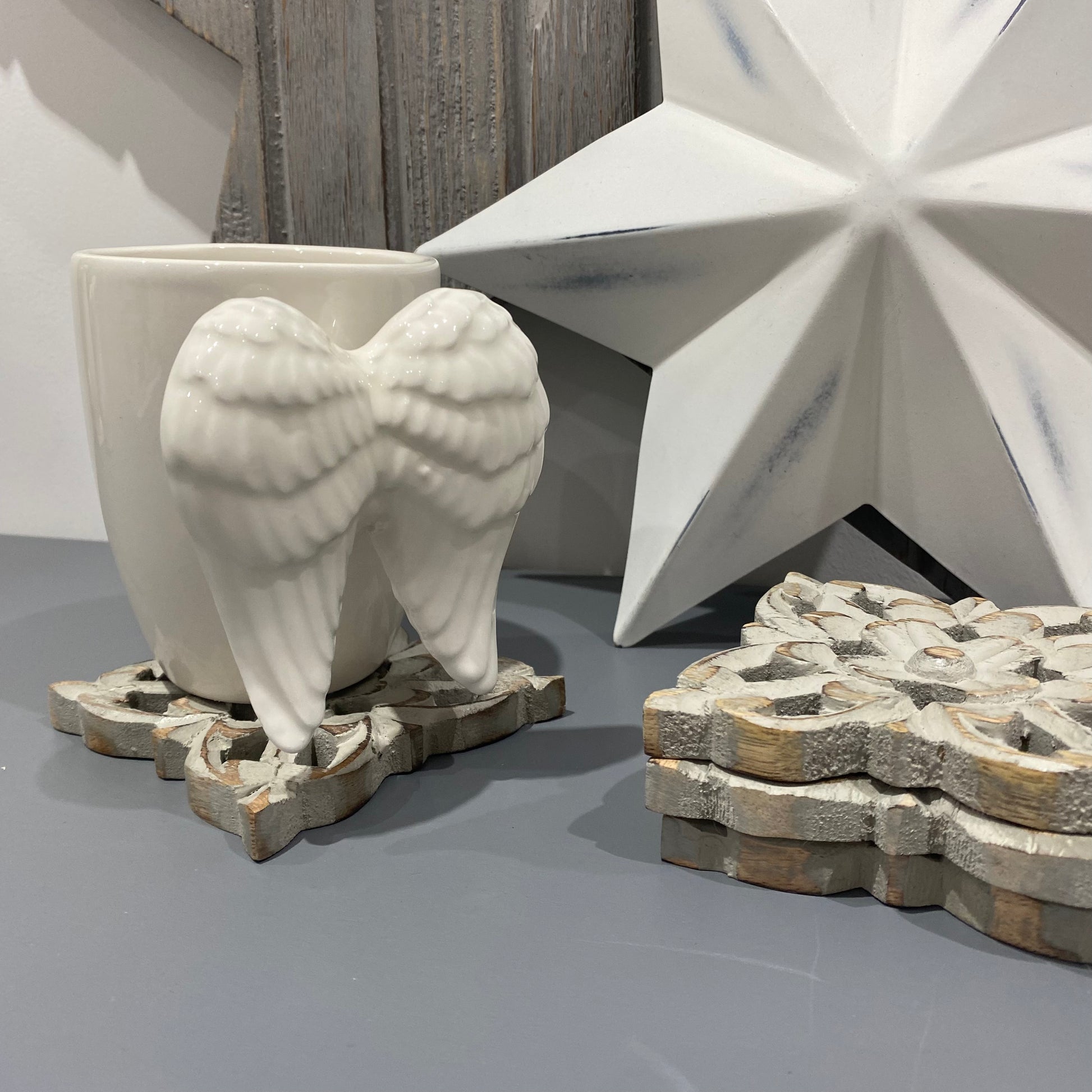 A beautiful shabby chic style white / light cream angel wing mug. A unique mug that has a simple while outer box makes it a perfect for gifting to a friend or family member.