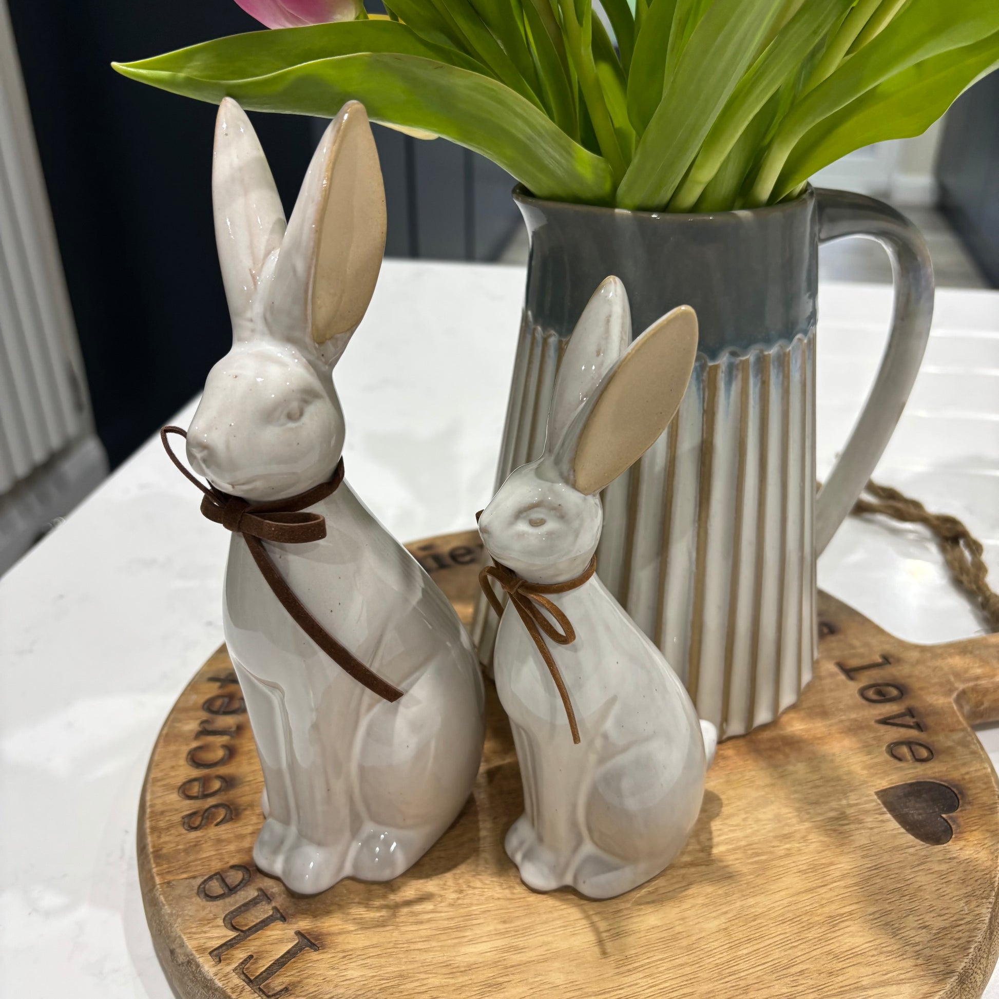 Add whimsy and charm to your home décor with this set of 2 white ceramic sitting bunny ornaments. Perfect for Easter décor, spring displays, or year-round whimsical styling, these decorative rabbits bring playful character to shelves, mantels, consoles, or tabletops.